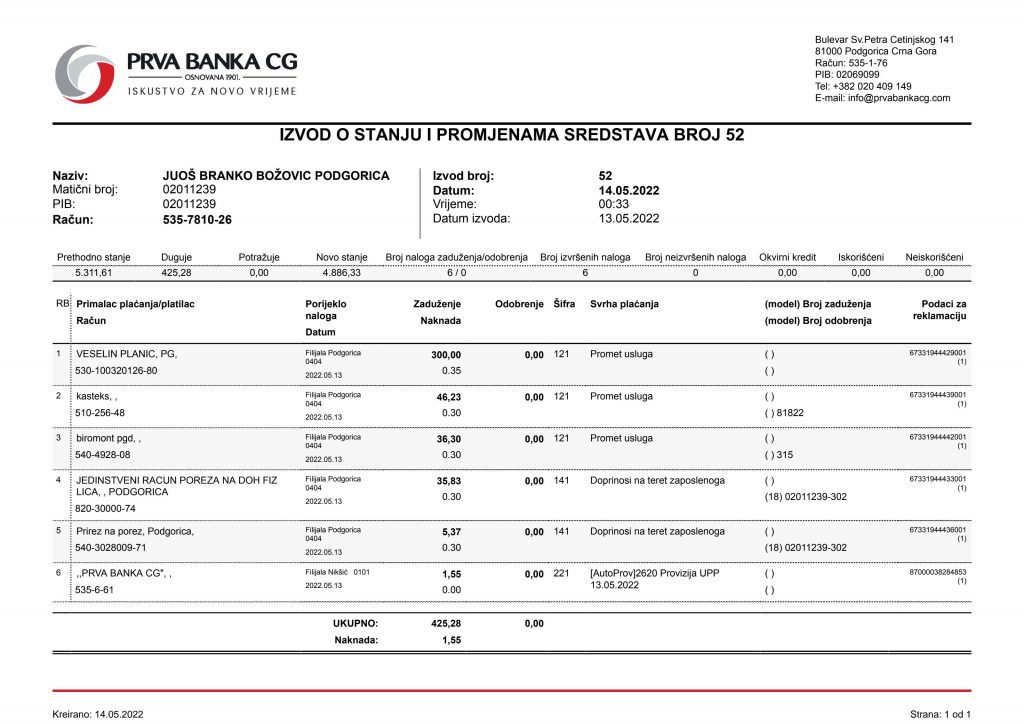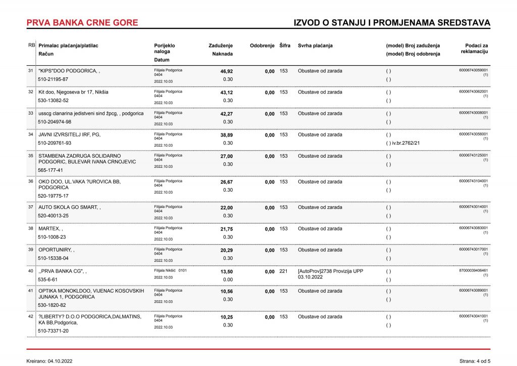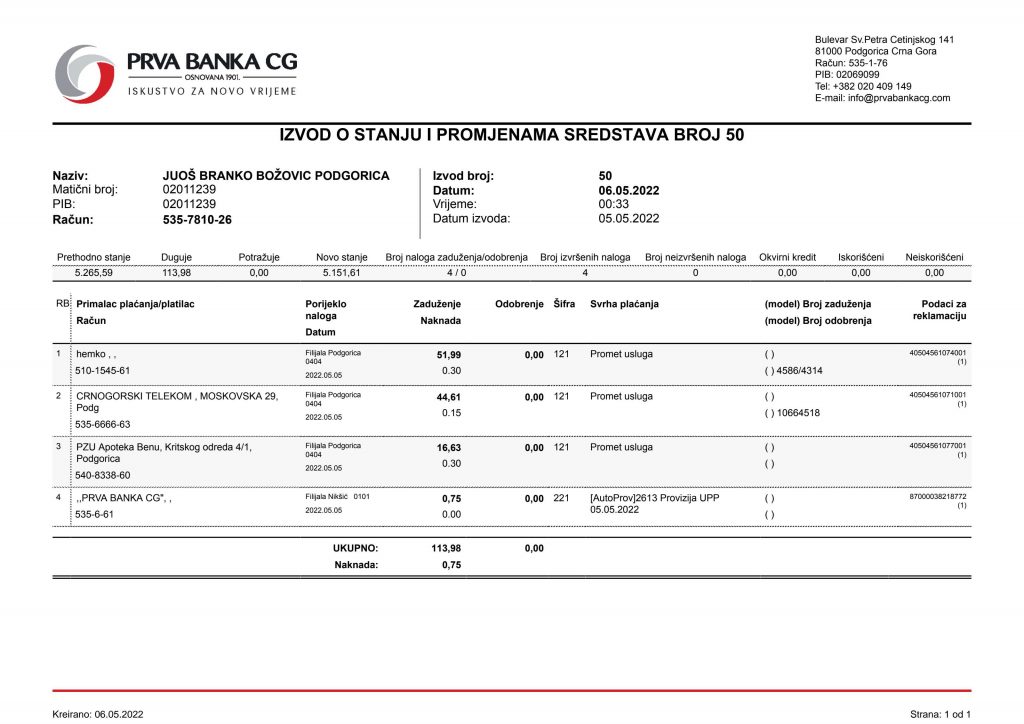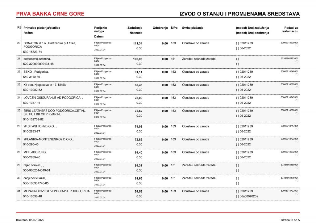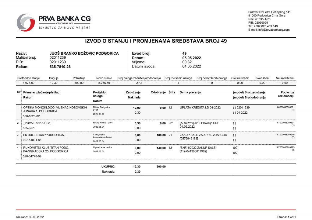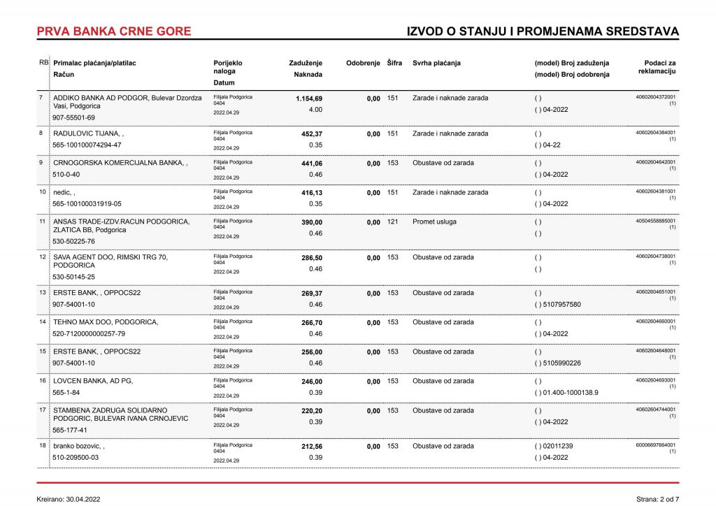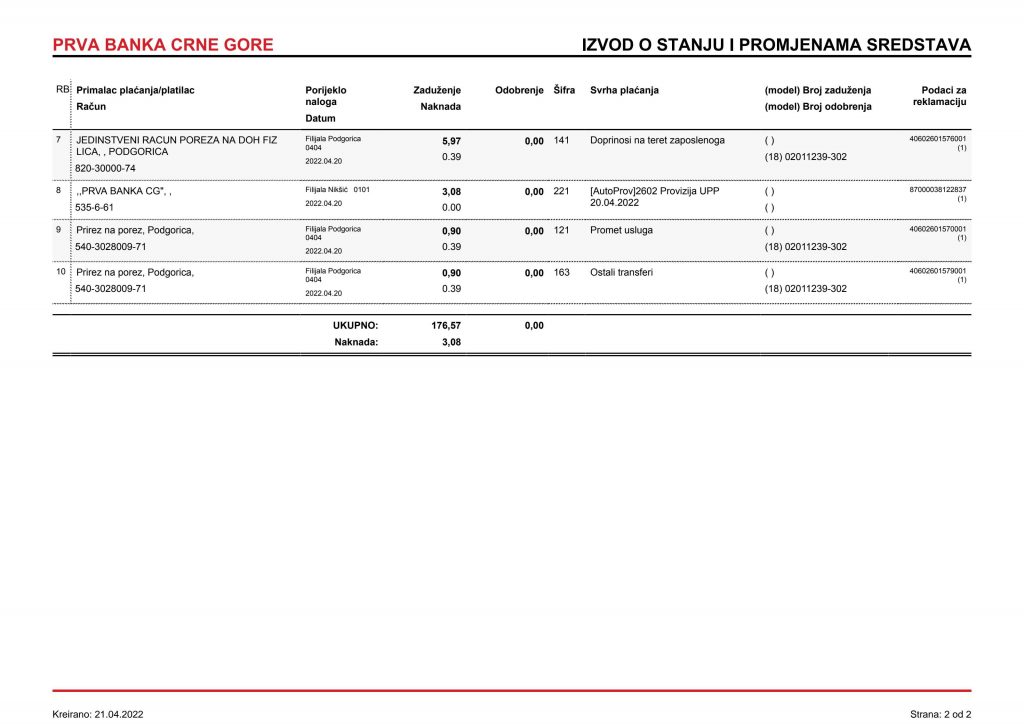 • Izvodi od 21. Aprila 2022.god.