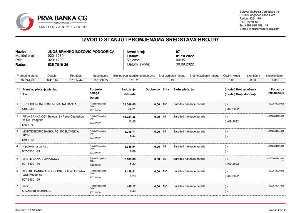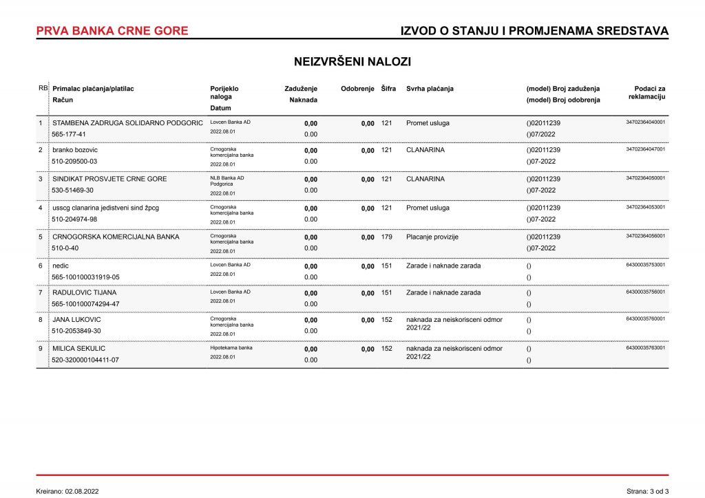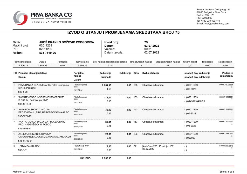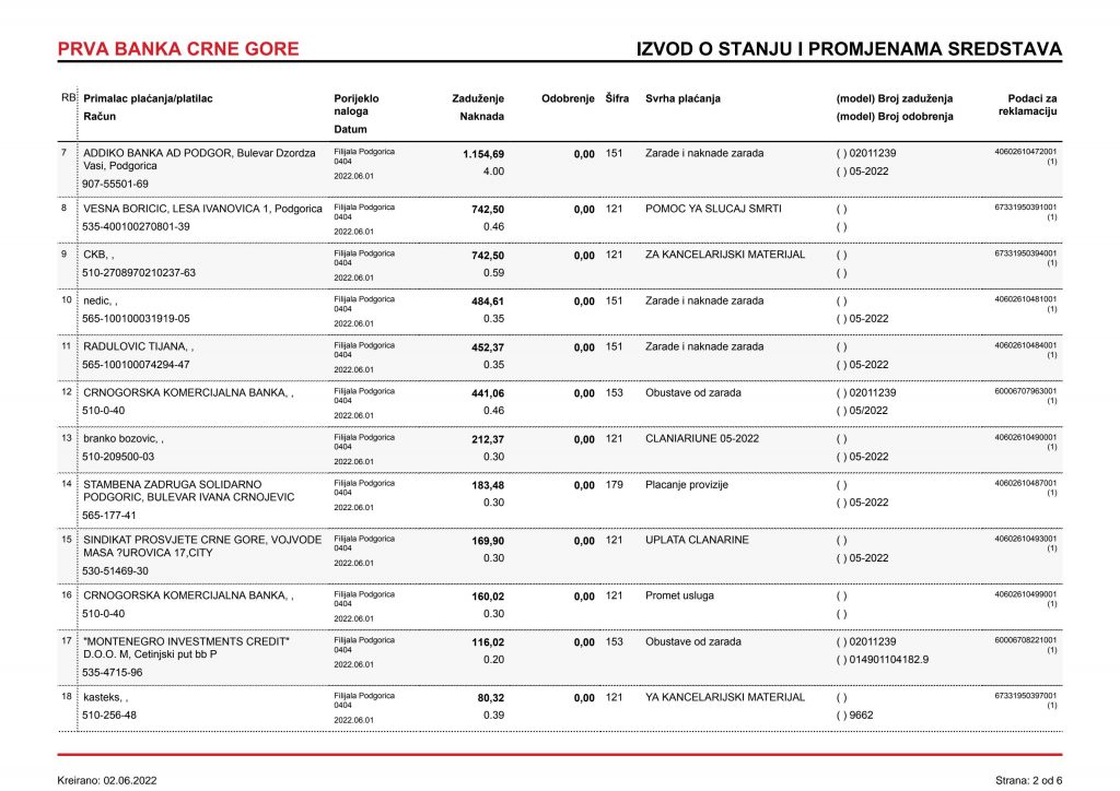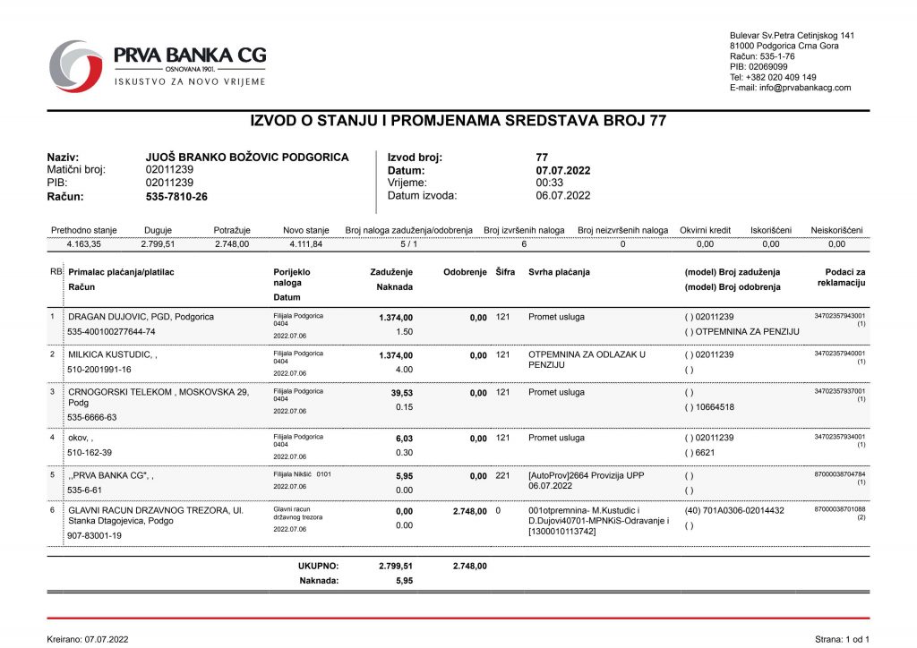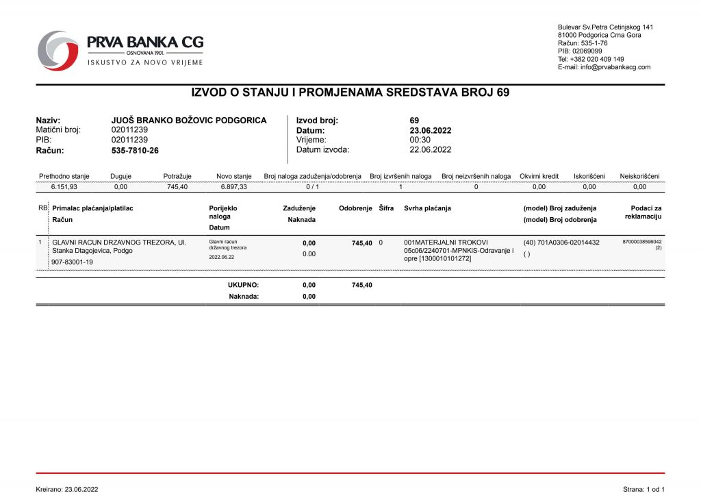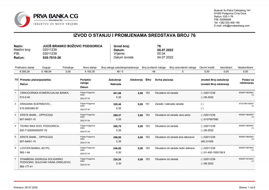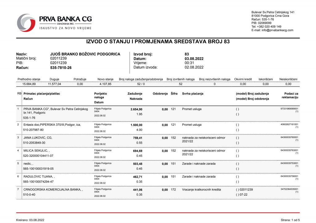 • Izvodi od 21. Aprila 2022.god.