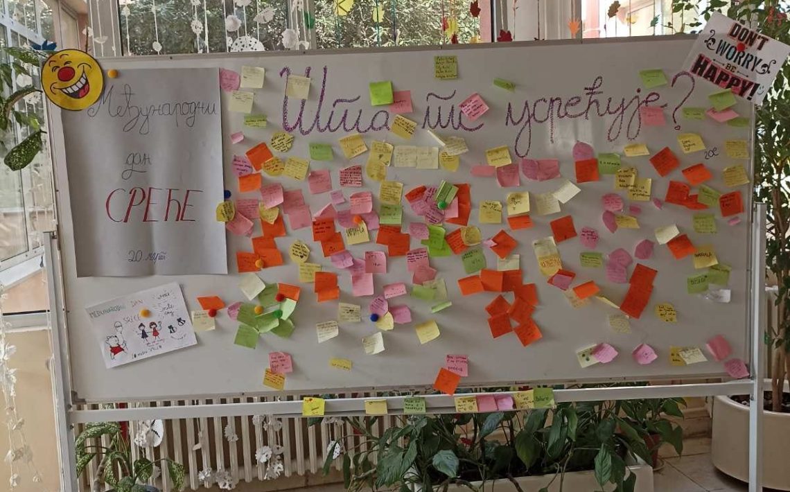 Povodom Međunarodnog dana sreće, 20. marta, naši parlamentarci osmislili su aktivnost. Naime, učenici su u holu škole, kao i nastavnici koji su to željeli, napisali na listićima šta ih usrećuje.