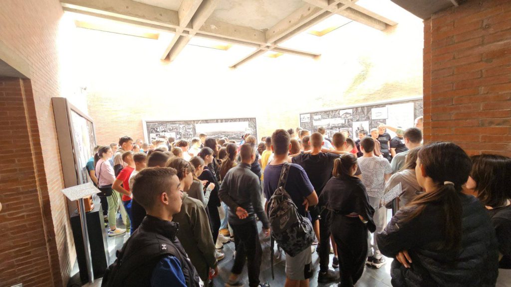 Pažnju učenika privukle su fotografije, poruke i predmeti nevinih žrtava, kao i originalni tekst pjesme “Krvava bajka”, prvo umjetničko djelo nastalo samo nekoliko dana nakon užasnog događaja. Stihove Desankinog djela čitali su iz rukopisa, ali i iz veza na bijelom platnu okačenom na zidu muzeja.