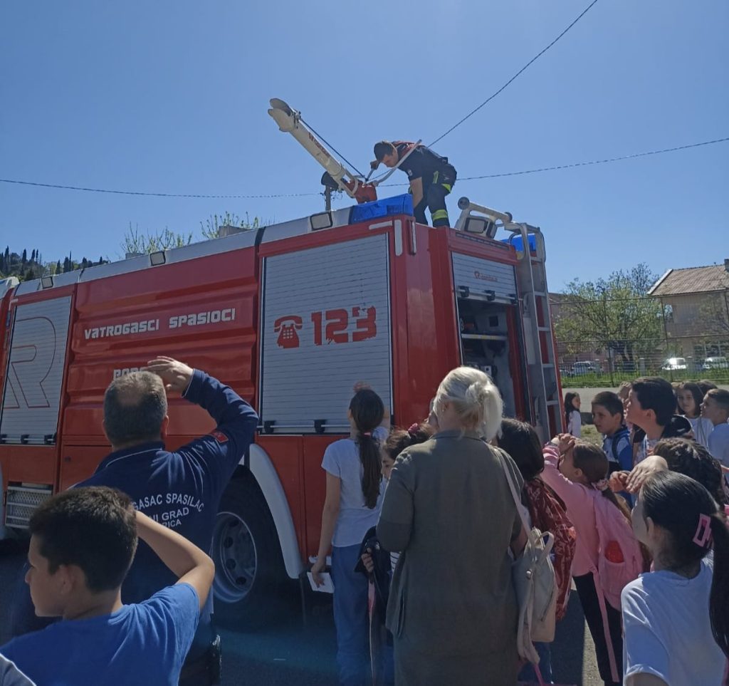 Učenici su dobili korisne informacije o tome kako postupiti u slučaju požara, upoznali se sa vatrogasnom opremom, vatrogasnim vozilom, načinom njihove upotrebe i funkcionisanja.